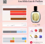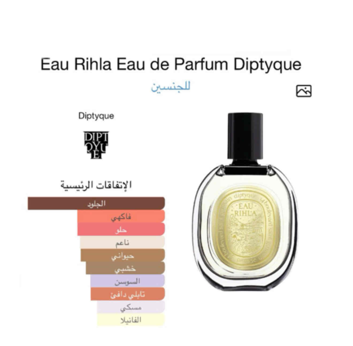 Eau Rihla Eau de Parfum Diptyque عطر شرقي – خشبي للجنسين. Eau Rihla Eau de Parfum صدر عام 2021. Fabrice Pellegrin قام بتوقيع هذا العطر. إفتتاحية العطر توت العليق, الزعفران و الفلفل الوردي; قلب العطر الجلود, السوسن و خشب الأرز; قاعدة العطر تتكون من الفانيليا و المسك.