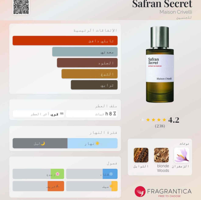 Safran Secret Maison Crivelli عطر خشبي – حار للجنسين. Safran Secret صدر عام 2025. Gaël Montero قام بتوقيع هذا العطر. إفتتاحية العطر التوابل; قلب العطر الزعفران; قاعدة العطر من أشجار شقراء.
