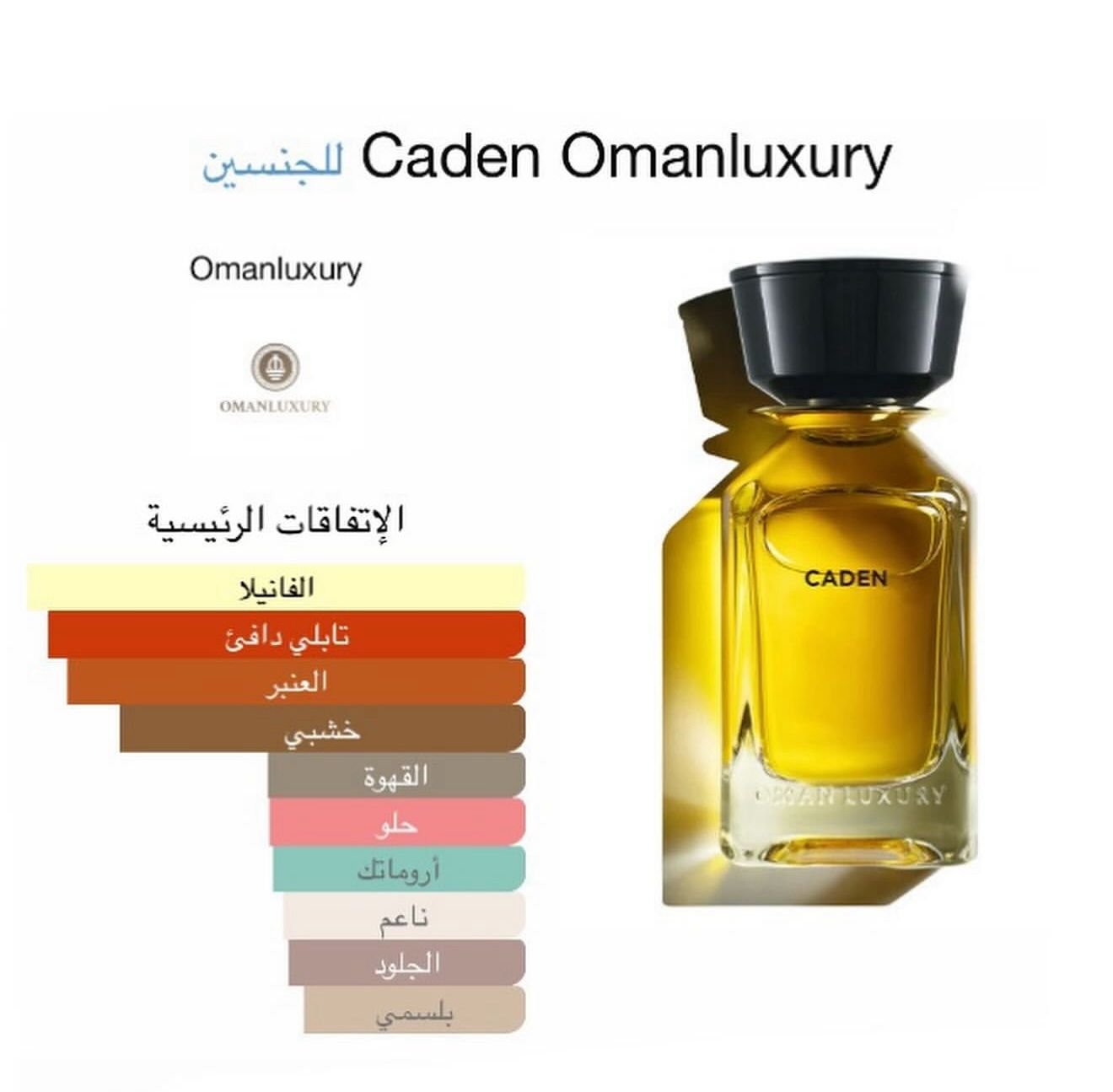 Caden Omanluxury عطر للجنسين. هذا عطر جديد Caden صدر عام 2025. Maxime Exler قام بتوقيع هذا العطر. إفتتاحية العطر الزعفران, الهيل, نغمات كحولية و زيت الكاد; قلب العطر القهوه, جلد الغزال (الجلد المدبوغ) و البنزوين – الجاوي; قاعدة العطر تتكون من الفانيليا, حبوب التونكا, أخشاب الغاياك, خشب العنبر و اللابدانوم.