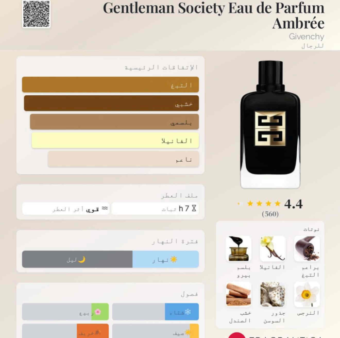 Gentleman Society Eau de Parfum Ambrée Givenchy عطر شرقي – خشبي للرجال . هذا عطر جديد Gentleman Society Eau de Parfum Ambrée صدر عام 2025. إفتتاحية العطر جوزه الطيب, المريمية و توت العرعر; قلب العطر النرجس, السوسن, خشب الصندل, نجيل الهند من مدغشقر و نجيل الهند من هايتي; قاعدة العطر تتكون من التبغ, فانيليا مدغشقر و بلسم بيرو.