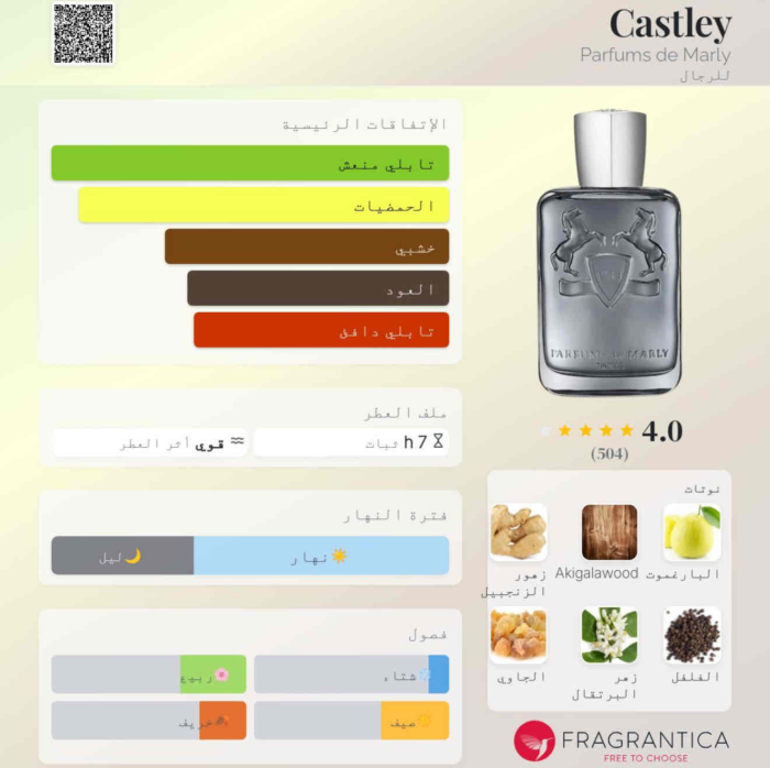 Castley Parfums de Marly عطر حمضيات – أروماتك للرجال . هذا عطر جديد Castley صدر عام 2025. إفتتاحية العطر البرغموت, الزنجبيل و الفلفل الأسود; قلب العطر النيرولي, الفلفل, البيتيتغرين و فلفل تيمور; قاعدة العطر تتكون من أكيغالاوود, البنزوين – الجاوي و اللابدانوم.