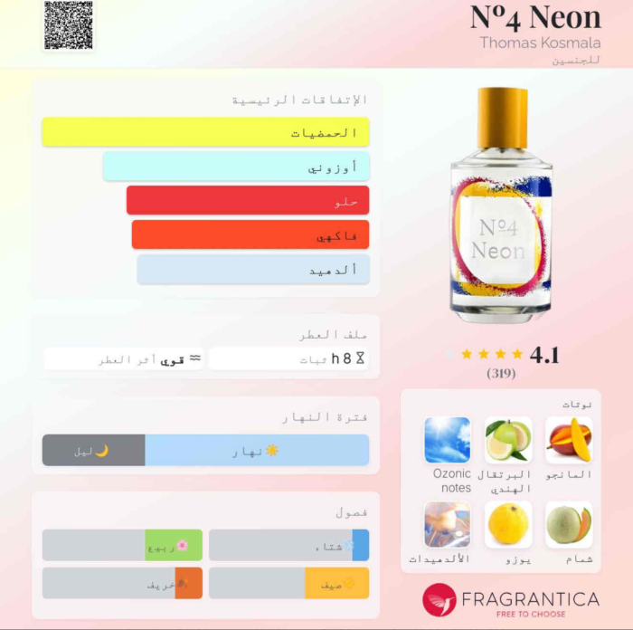 Nº4 Neon Thomas Kosmala عطر أروماتك للجنسين. هذا عطر جديد Nº4 Neon صدر عام 2023. Thomas Kosmala قام بتوقيع هذا العطر. إفتتاحية العطر البرتقال الهندي, يوزو و الماندرين (اليوسفي); قلب العطر المانجو, شمام و الغلابانوم; قاعدة العطر تتكون من وتلاحظ Ozonic, الألدهيدات و وتلاحظ الشمسية.