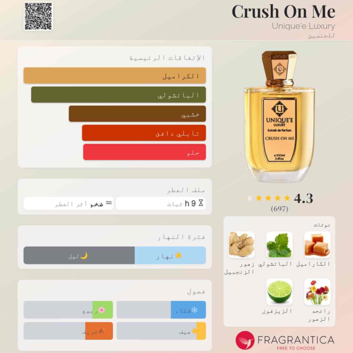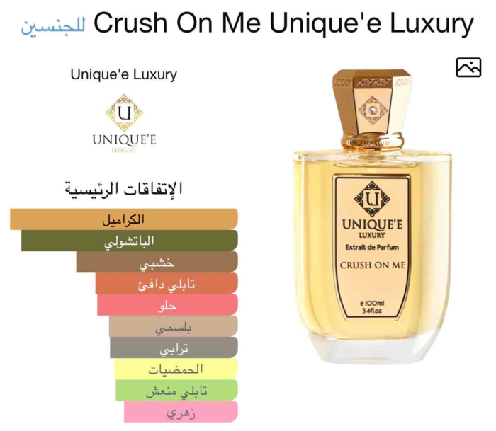 Crush On Me Unique’e Luxury عطر للجنسين. Crush On Me صدر عام 2021. Gökhan Şimşek قام بتوقيع هذا العطر. إفتتاحية العطر الزنجبيل و الليم – الزيزفون; قلب العطر النوتات الزهرية; قاعدة العطر تتكون من الكاراميل و الباتشولي.